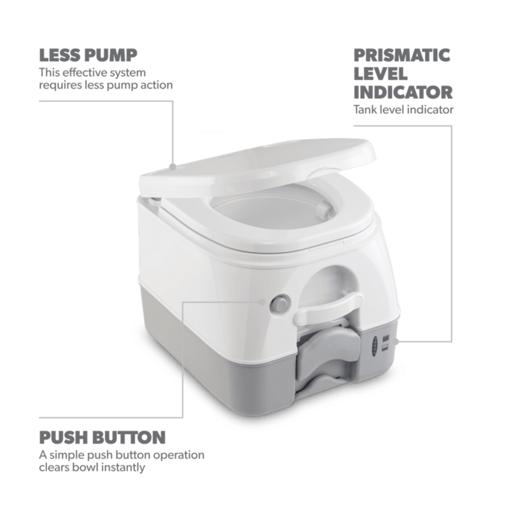 The clever design of the Dometic 972 portable toilet incorporates space saving qualities that make it a pragmatic addition for smaller RVs and tents. Available in two sizes and colors, with an adult sized seat it offers the comfort of home wherever you are. Push-button technology ensures less pumping, less splashing and a powerful, hygienic flush. The 9.8 l tank, with a tank level indicator, conta