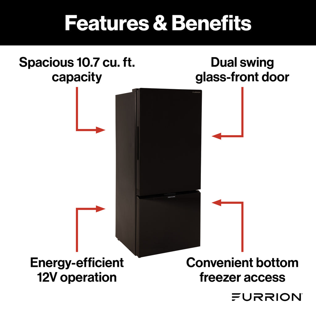Furrion - 12V RV Refrigerator 10.7 Cu Ft Dual Swing Glass Doors Bottom Freezer Black Glass FCR10DCGBA-BG-DS
