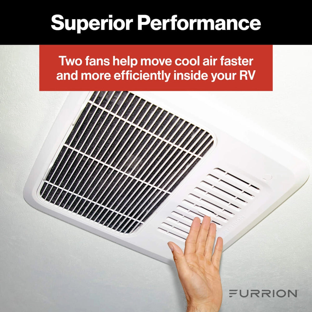 - SUPERIOR PERFORMANCE — The Furrion Chill HE RV roof air conditioner has two fans to help move cool air faster and more efficiently inside your RV. It provides 13,500 BTUs of cooling power and is ideal for RVs, campers, and other trailers
