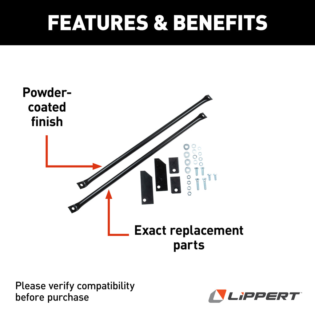 Need a bumper brace for your camper tie down system? Lippert supplies bumper brace sets made specifically for HappiJac tie downs that are easy to install and help you secure your truck camper. Our HappiJac® tie down kits combine frame strength and sound engineering principles to create an I-beam truss structure that makes your camper an integral part of the truck, providing unsurpassed strength and security. Its Direct-to-Frame mount is strong and easy to use