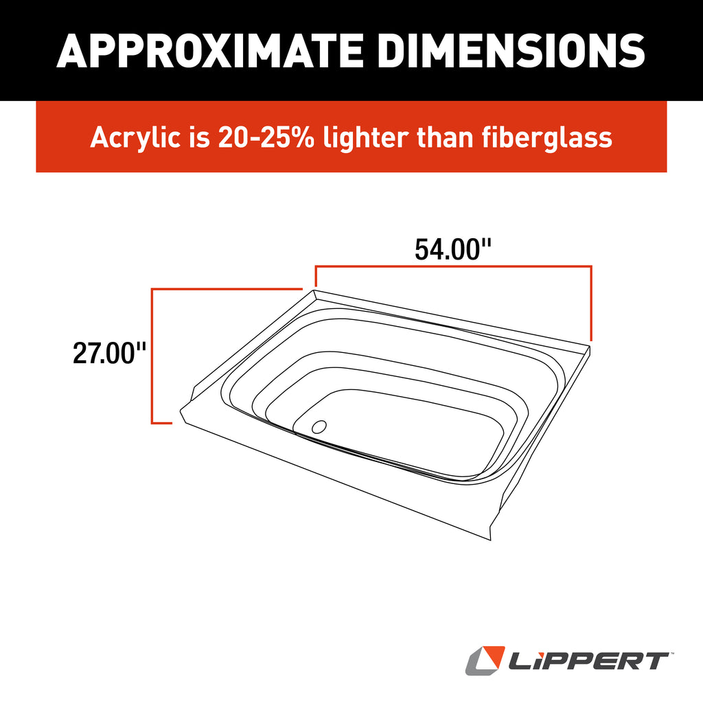 - What are the dimensions of the lippert bathtub with left drain? The Lippert Bathtub measures 27 inches by 54 inches.
