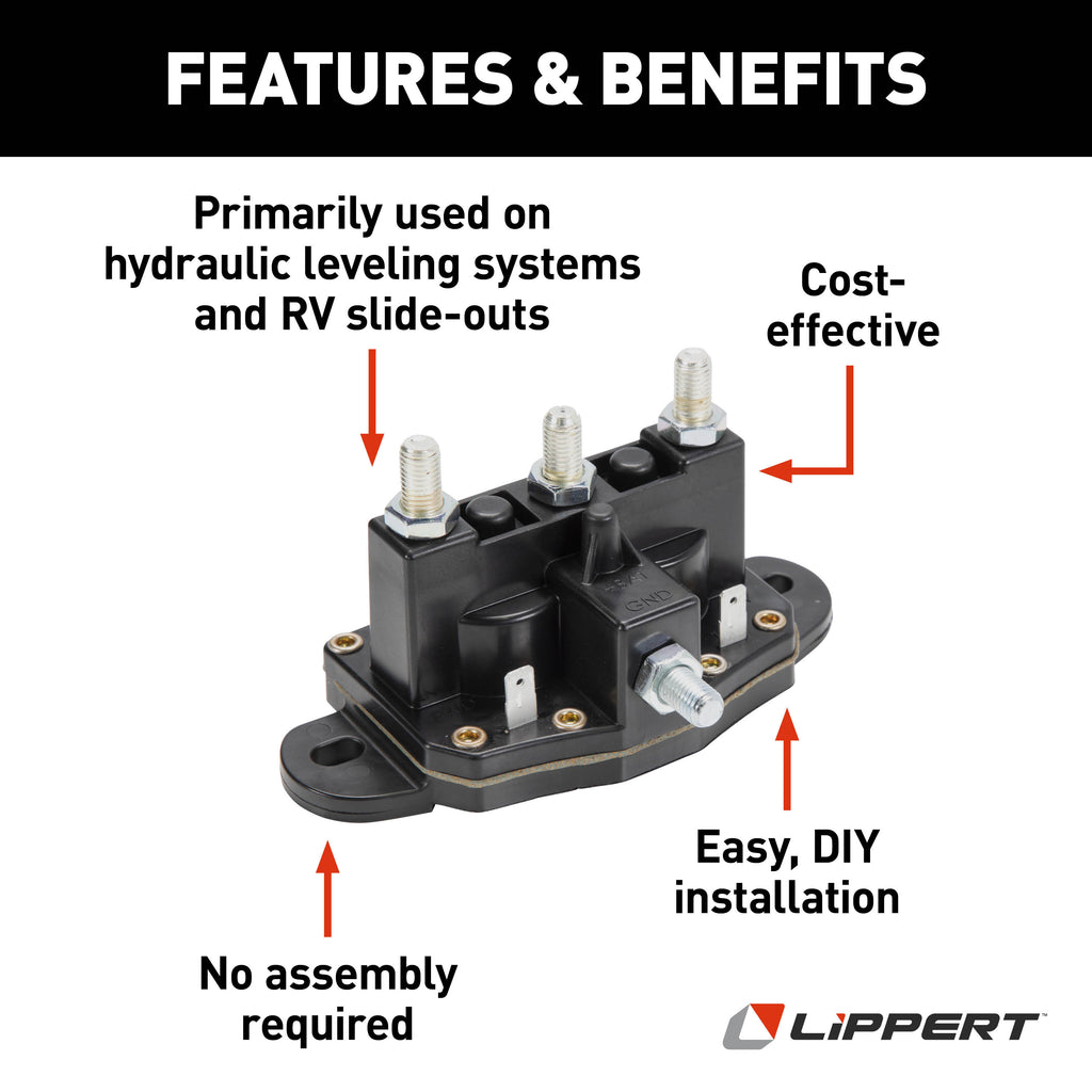Broken hydraulic leveling system or slide-out keeping you from camping? Fix it with a dual-polarity solenoid. Our Lippert genuine replacement parts are exact matches for your 5th wheel RV, travel trailer or motorhome equipment. This component is a cost-effective simple solution for reversing polarity of permanent magnet DC motors on slide-out or automatic leveling system. And since it matches your existing part, installation can be made faster, helping you get back to enjoying your RV and camping.