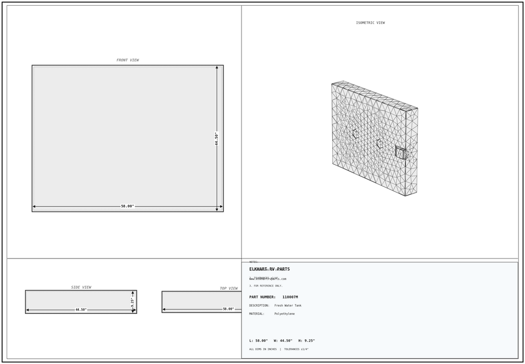 The MAKS 81-gallon fresh water tank delivers exceptional potable water storage with a specialized dual-cone design for enhanced drainage performance. Measuring 44.5 inches by 58 inches by 7.75 inches, this molded tank features an end center low point drain configuration designed for complete water evacuation during winterization and maintenance. The dual cone design with factory-molded drain fitting ensures every drop can be drained from the system. Built with MAKS Plastics' proven seamless roto-molding technology and food-grade, UV-stabilized materials, this tank provides safe, clean fresh water storage for large motorhomes, travel trailers, and fifth wheels.