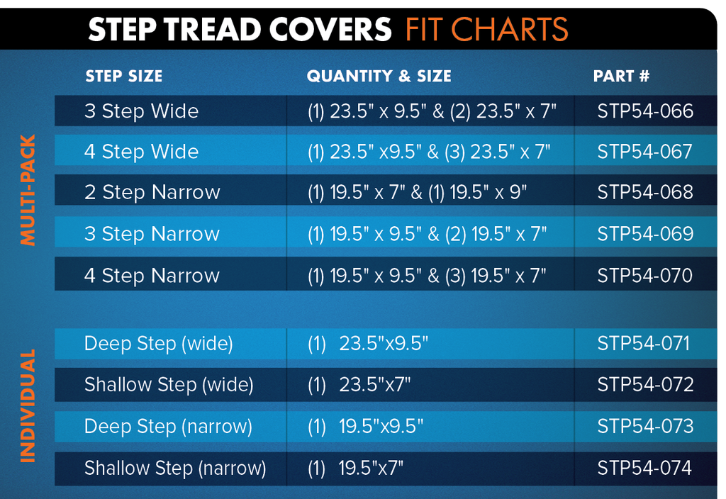 Make sure you order the correct size for your StepAbove system. Use the chart below to find the right tread pack: