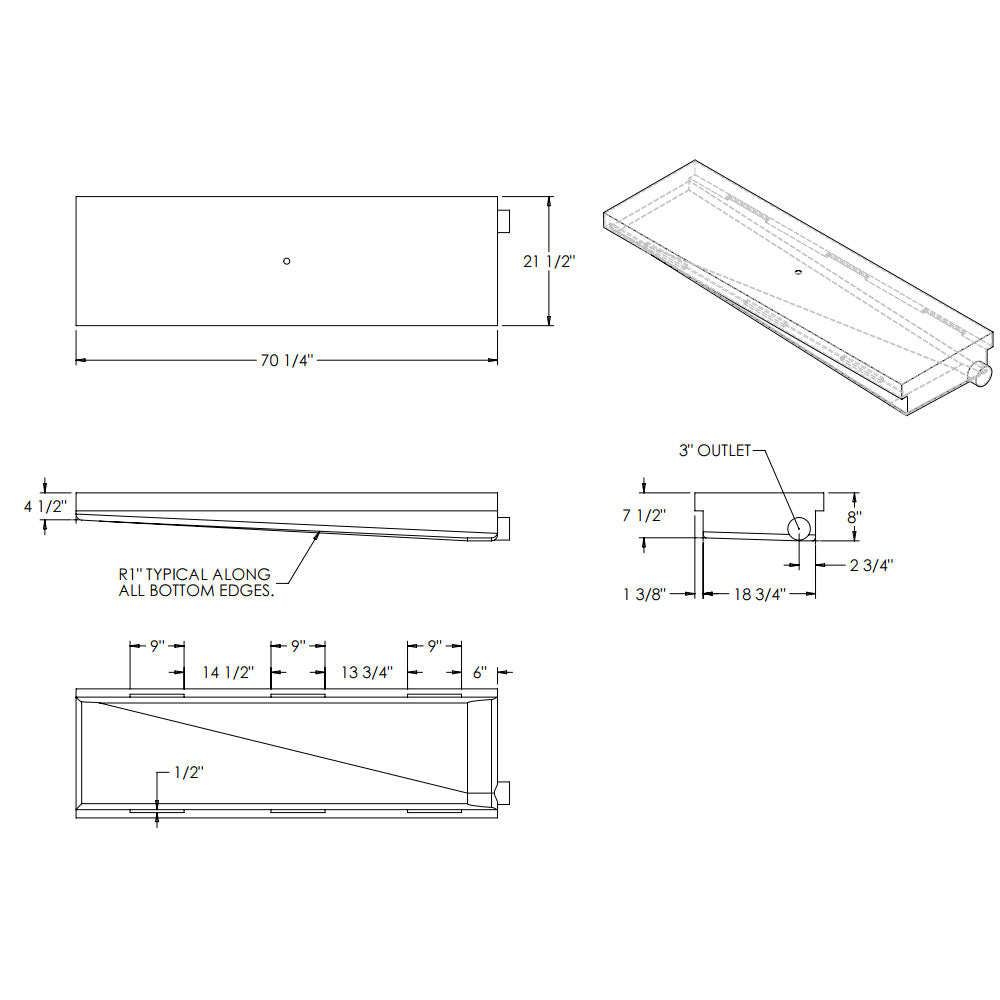 - What are the dimensions of this holding tank? The tank measures 70-1/4 inches in length, 21-1/2 inches in width, and 8 inches in height.