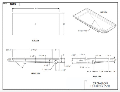 - What are the dimensions of the 29 gallon rv holding tank? The tank measures 60 inches in length, 28 inches in width, and 7 inches in height.