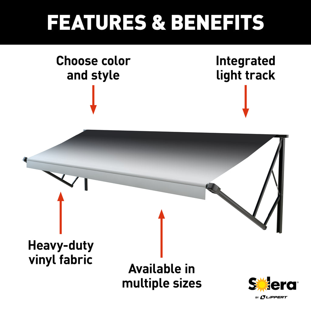 - Can i add lighting to this awning assembly? Yes, the awning fabric includes an integrated lighting track that makes it easy to add the Solera LED light kit.