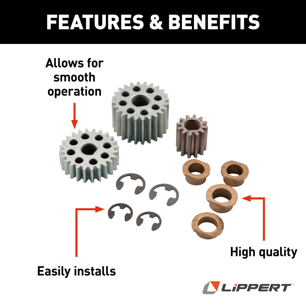 The Solera Power Awning Drive Head Gear Kit is designed specifically for Solera Power Awning Assemblies, ensuring a precise fit and smooth operation. Its compact, lightweight build makes installation easy without adding extra bulk to your RV. Perfect for quick repairs or replacements, this kit helps keep your awning working reliably on every adventure.---