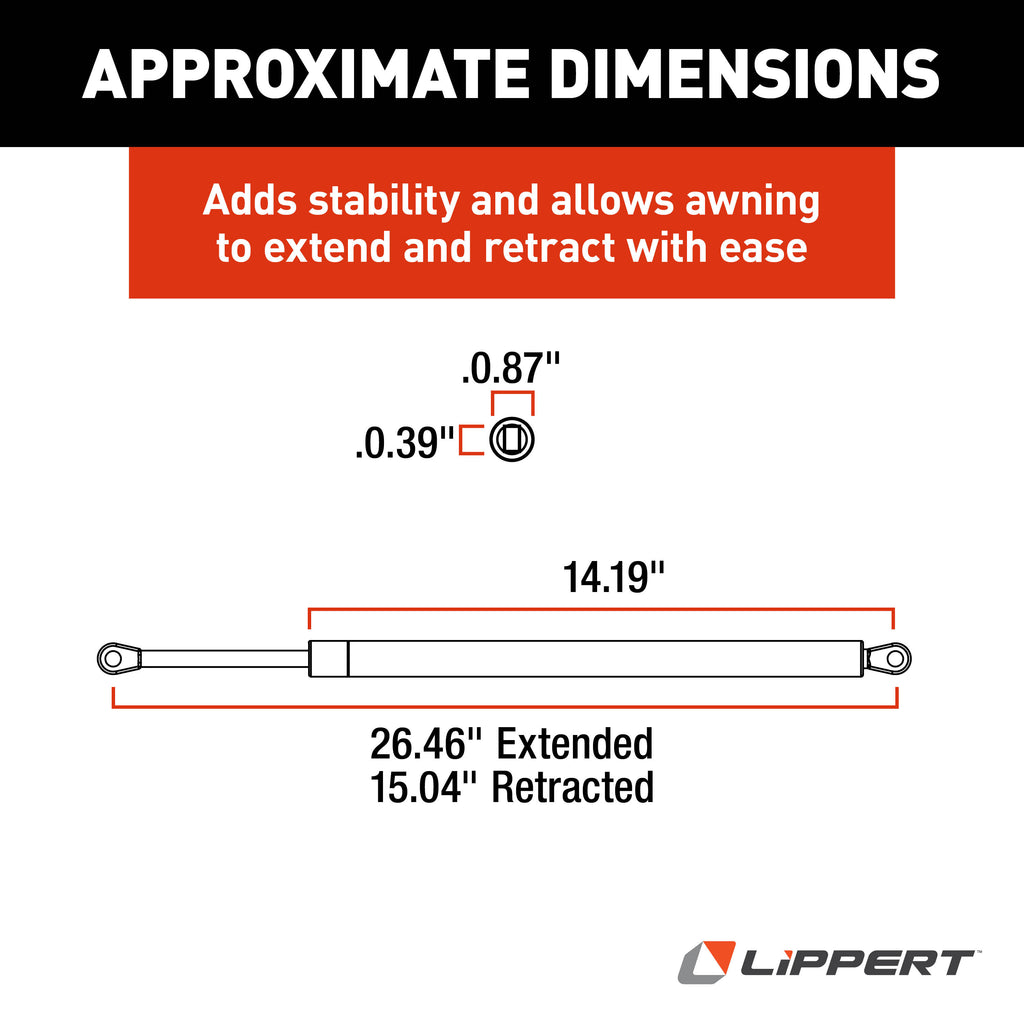When it comes to replacement parts for your Solera® awning assembly, look no further than Lippert. We have exact-match Solera replacement parts, so you don't have to search high and low for the correct equipment. This replacement gas strut for Solera power and manual awnings can replace old, worn or broken equipment. Easy to install and operate, this hardware will let you get back to operating your Solera manual awning as usual.