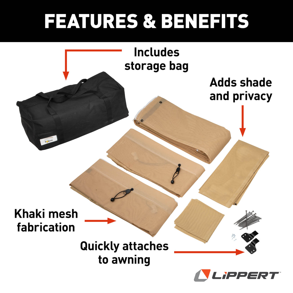 This awning screen room kit comes complete with (3) mesh, khaki screen panels, (1) storage bag and all necessary mounitng and installation hardware. Our Solera screen room is compatible with most power and manual awnings on the market today, specifically, 8’ extension Solera, Dometic®, and Carefree™ awnings. Multiple sizes are available ranging from 10' to 21'.