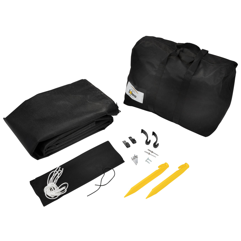 - Does the solera side shade panel come with installation hardware? Yes, the kit includes mounting brackets, a pull rod, stakes, tie-outs, screws, rivets, and a storage bag for easy installation and storage.