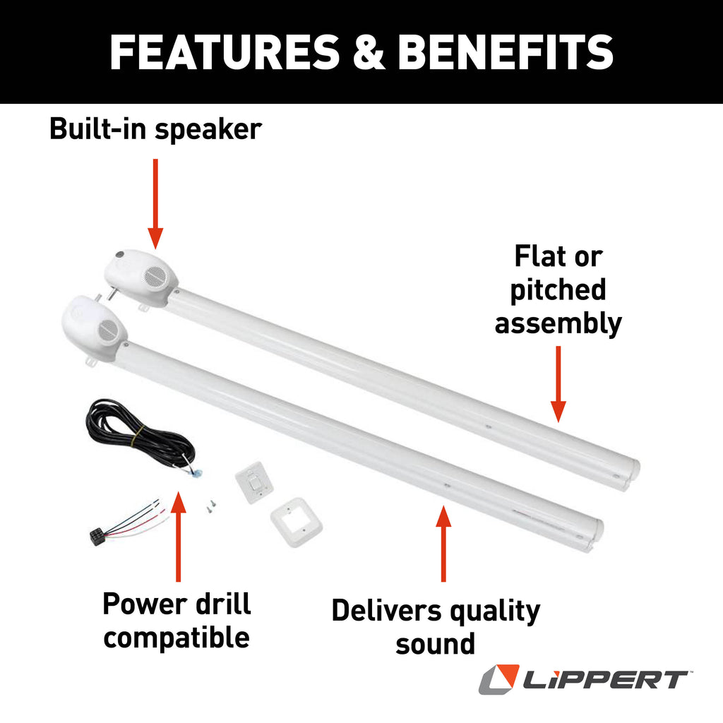 | Components included | 2 speaker heads, 2 awning arm assemblies, 1 switch, 1 wiring harness, mounting hardware |