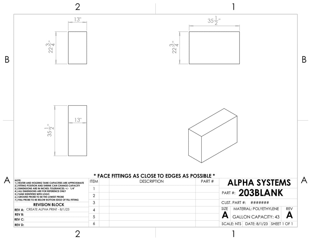 - What are the dimensions of this fresh water tank? The tank measures 35 1/2 inches in length, 22 3/4 inches in width, and 13 inches in height.