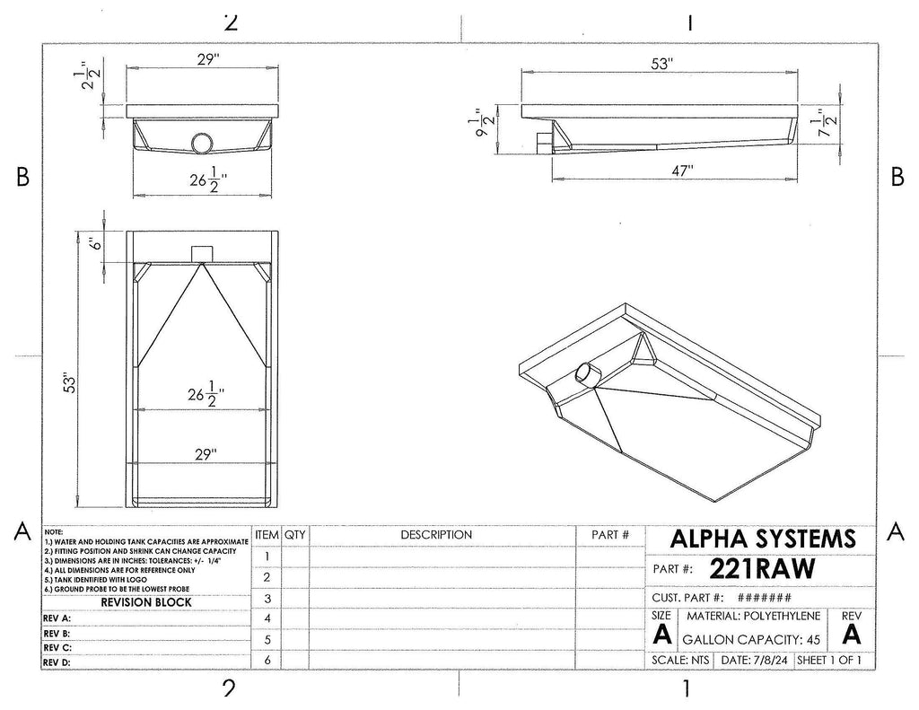 - Does this holding tank meet health and safety standards? Yes, the Alpha 221BLANK holding tank is manufactured to strict specifications to meet all necessary health and safety requirements for RV waste management.
