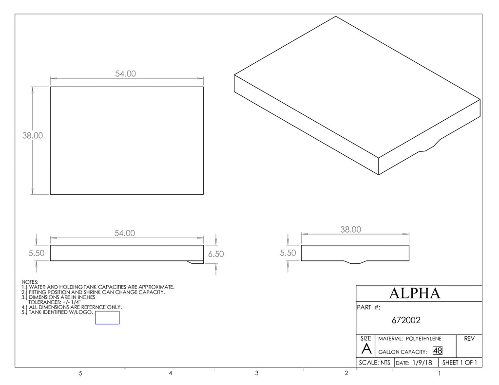 - What are the dimensions of this fresh water tank? The tank measures 54 inches in length, 38 inches in width, and 6 1/2 inches in height.