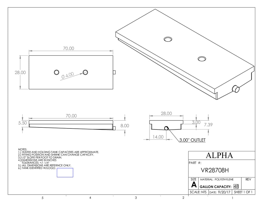 - What is the capacity of the alpha vr28708hblank holding tank? The Alpha VR28708HBLANK holding tank has a capacity of 48 gallons.
