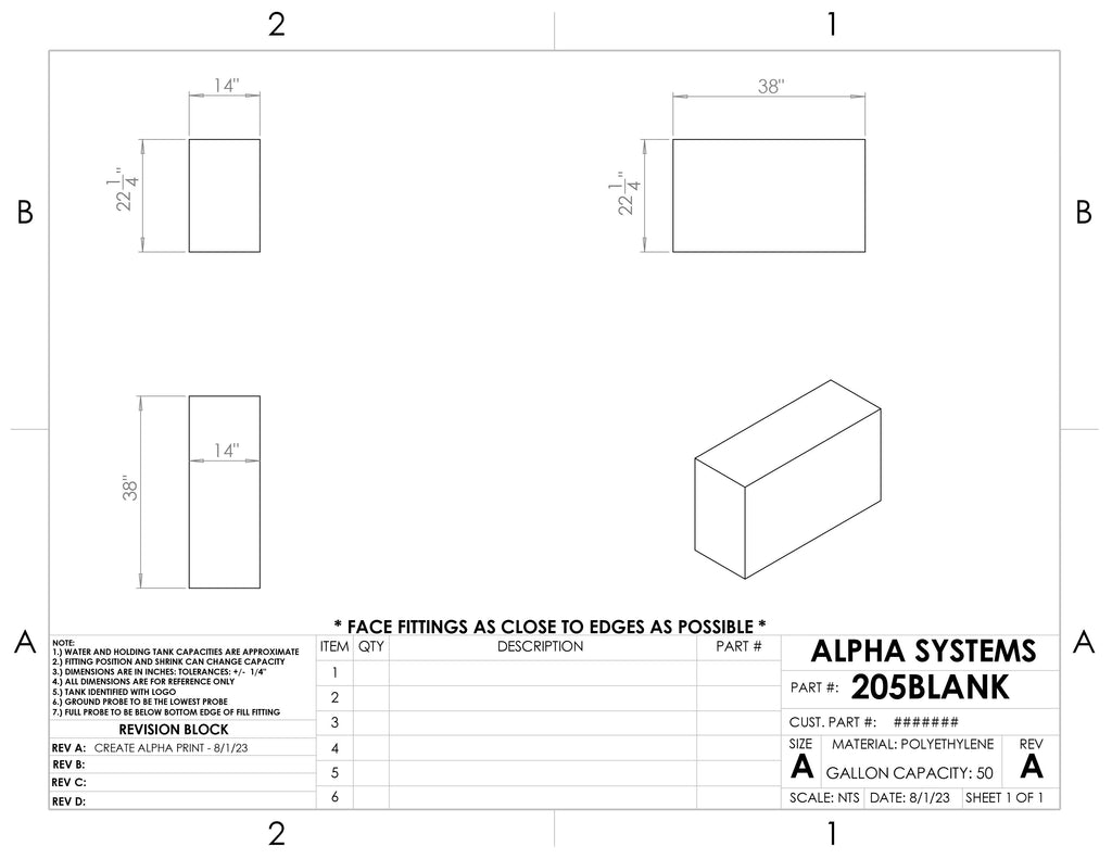 - What are the dimensions of the alpha 50 gallons fresh water tank? The tank measures 38 inches in length, 22 1/4 inches in width, and 14 inches in height.