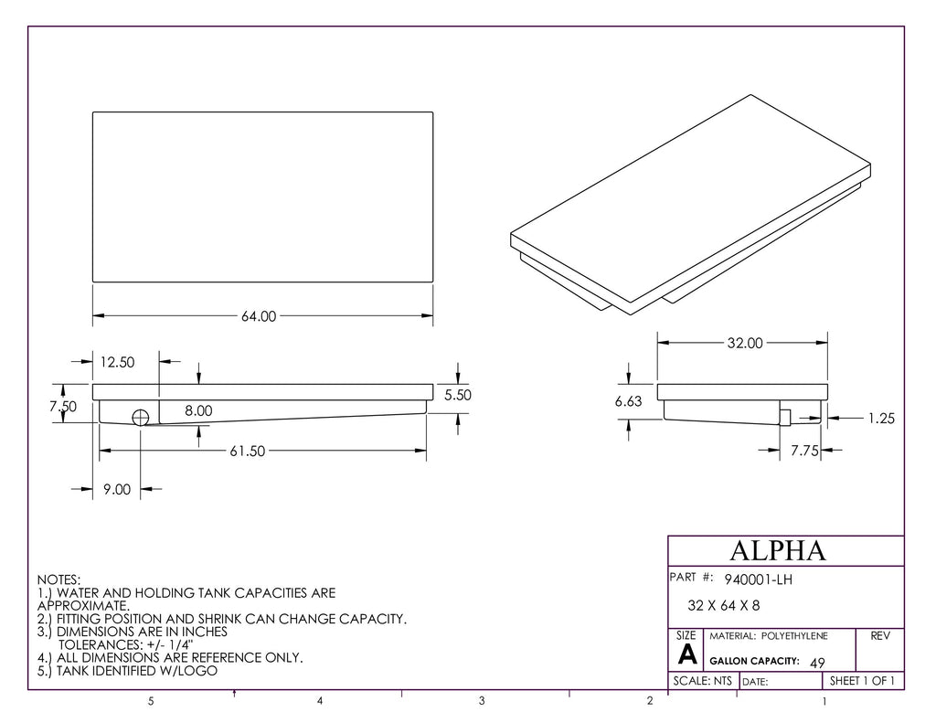 - What are the dimensions of the alpha 50 gallons holding tank? The tank measures 64 inches in length, 32 inches in width, and 8 inches in height.