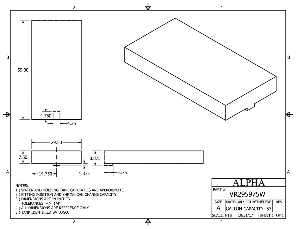 - What are the dimensions of this fresh water tank? The tank measures 59 inches in length, 29 1/2 inches in width, and 8 7/8 inches in height.