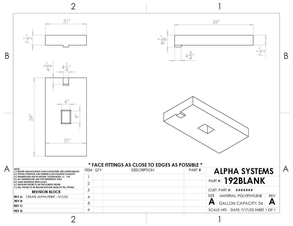 - What are the dimensions of the alpha fresh water tank? The tank measures 59 inches in length, 31 inches in width, and 8 7/8 inches in height.