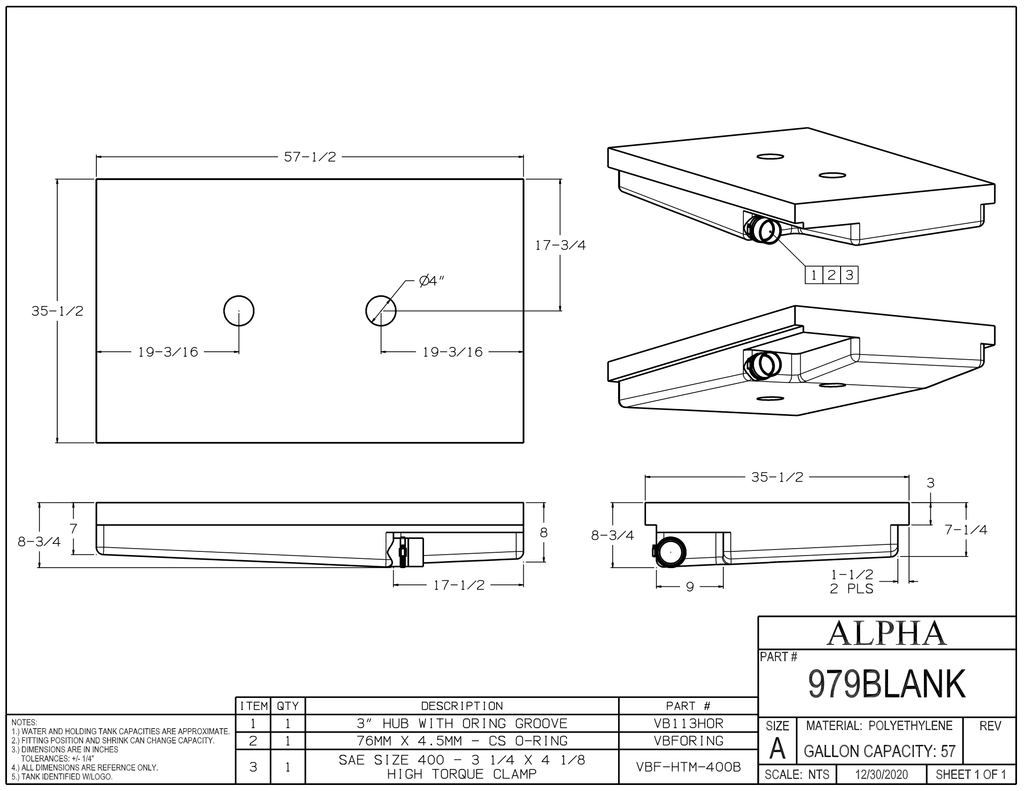 - What are the dimensions of the alpha 57 gallons holding tank? The tank measures 57 1/2 inches in length, 35 1/2 inches in width, and 8 3/4 inches in height.