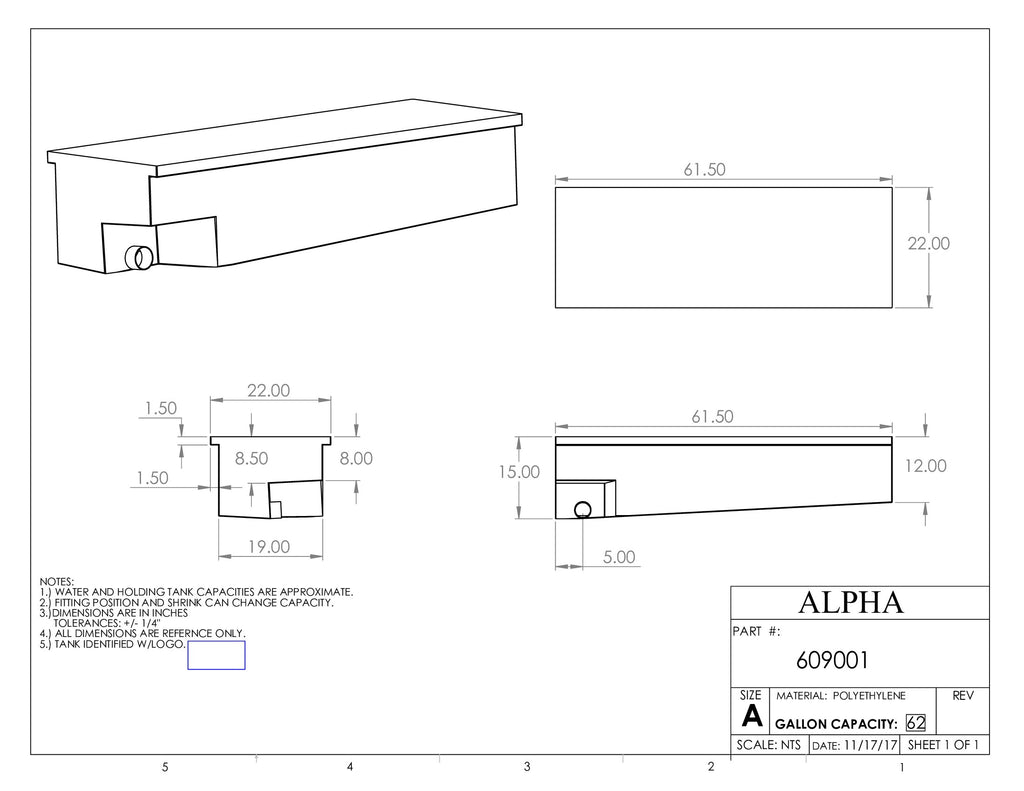 - How durable is the alpha 62 gallon holding tank? The tank is made with extra durable rotational molded construction, creating a seamless, one-piece tank that offers superior strength and longevity.