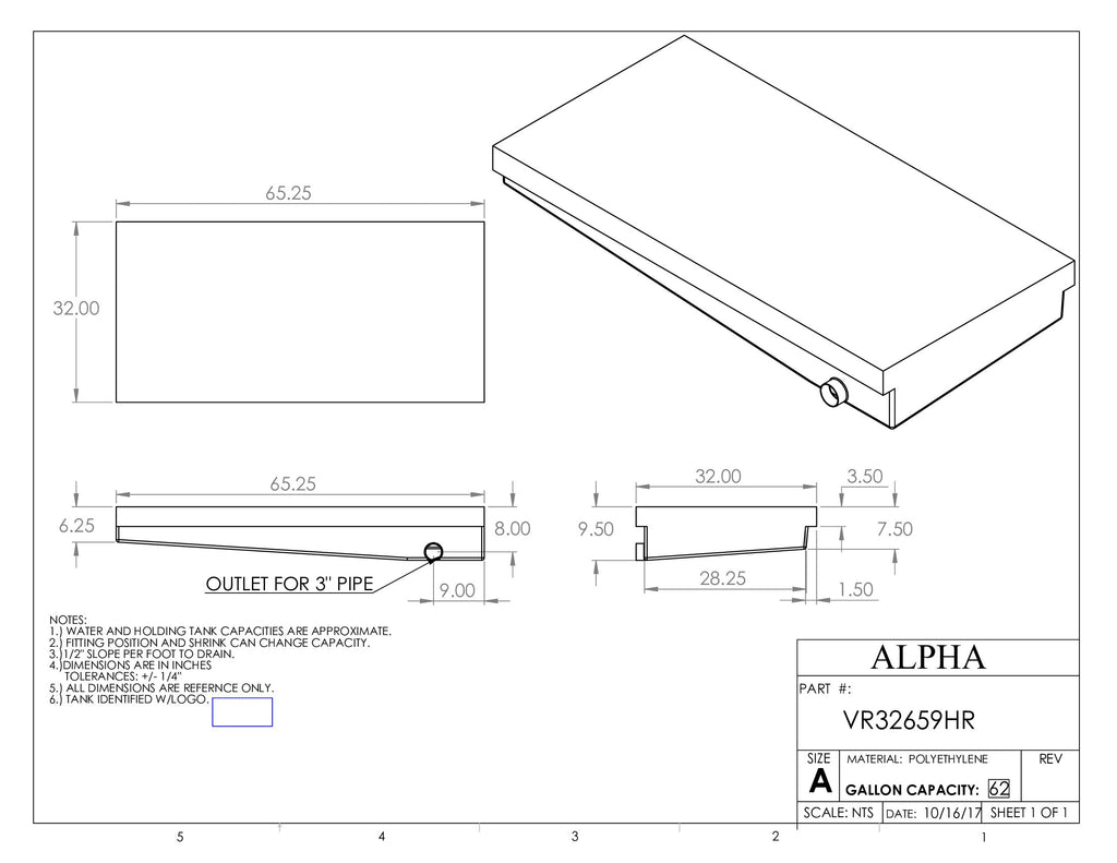 - What are the dimensions of this holding tank? The holding tank measures 65 1/4 inches in length, 32 inches in width, and 9 1/2 inches in height.