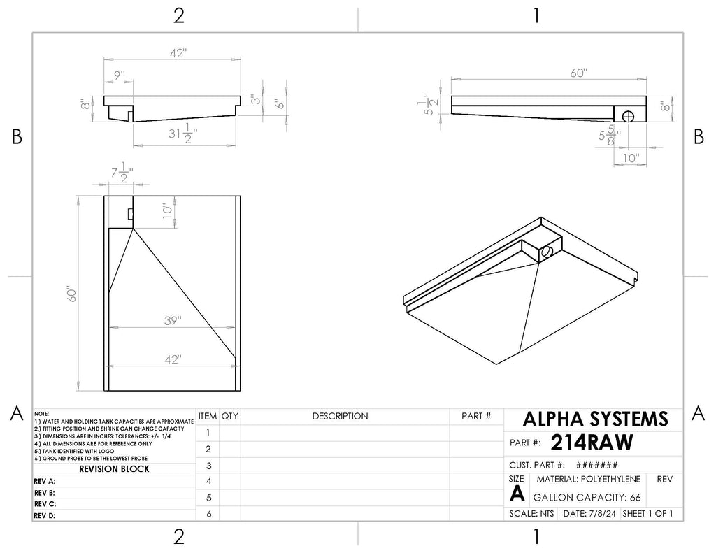 - What are the dimensions of the alpha 66 gallons holding tank? The tank measures 60 inches in length, 42 inches in width, and 8 inches in height.