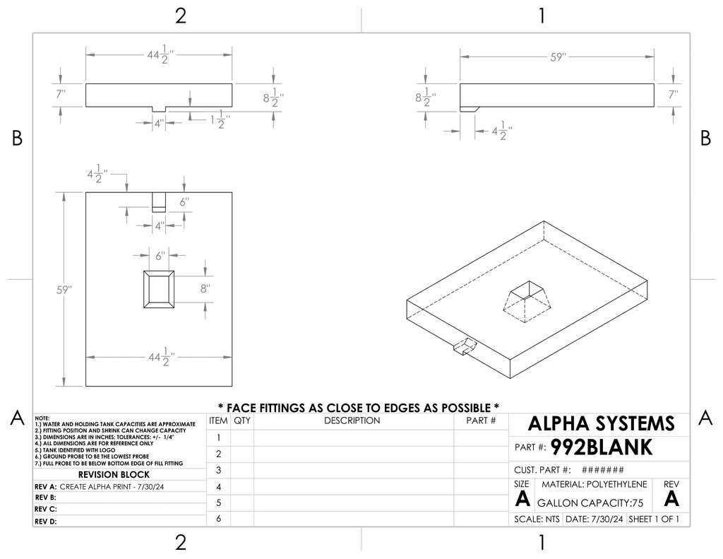 Alpha - 75 Gallons Fresh Water Tank - 59" x 44 1/2" x 8 1/2" * - 992BLANK