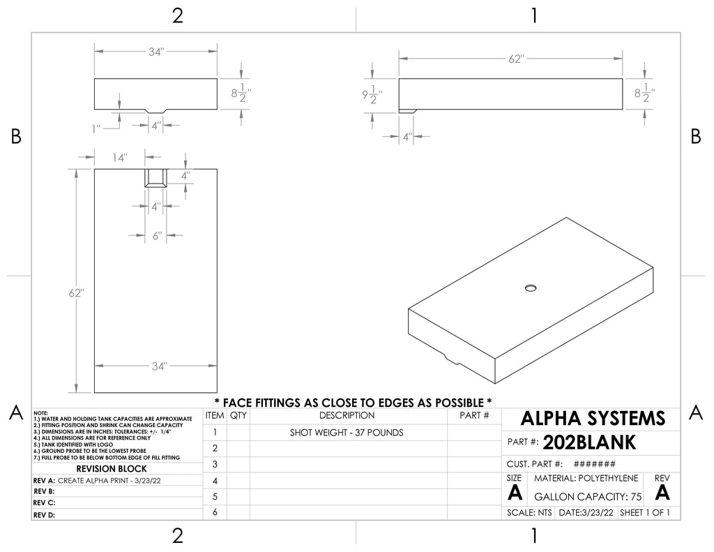- What material is the alpha 75 gallons fresh water tank made of? The tank is made from high-quality, durable polyethylene that is FDA-approved for safe drinking water storage.