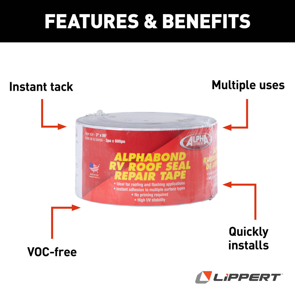 A state-of-the-art proprietary adhesive, ALPHABOND TPO tape is the go-to tape for your next RV roofing project. Pressure-sensitive, it has an aggressive “instant tack” adhesive. Wood, metal, fiberboard, ISO board, and concrete, as well as EPDM, TPO, PVC, and mixed elastomer roofing membranes — you name it, it adheres to it. Plus, it boasts a UV-stable TPO facer that makes it ideal for flashing. And now all Alpha Systems products our exclusively distributed by Lippert.