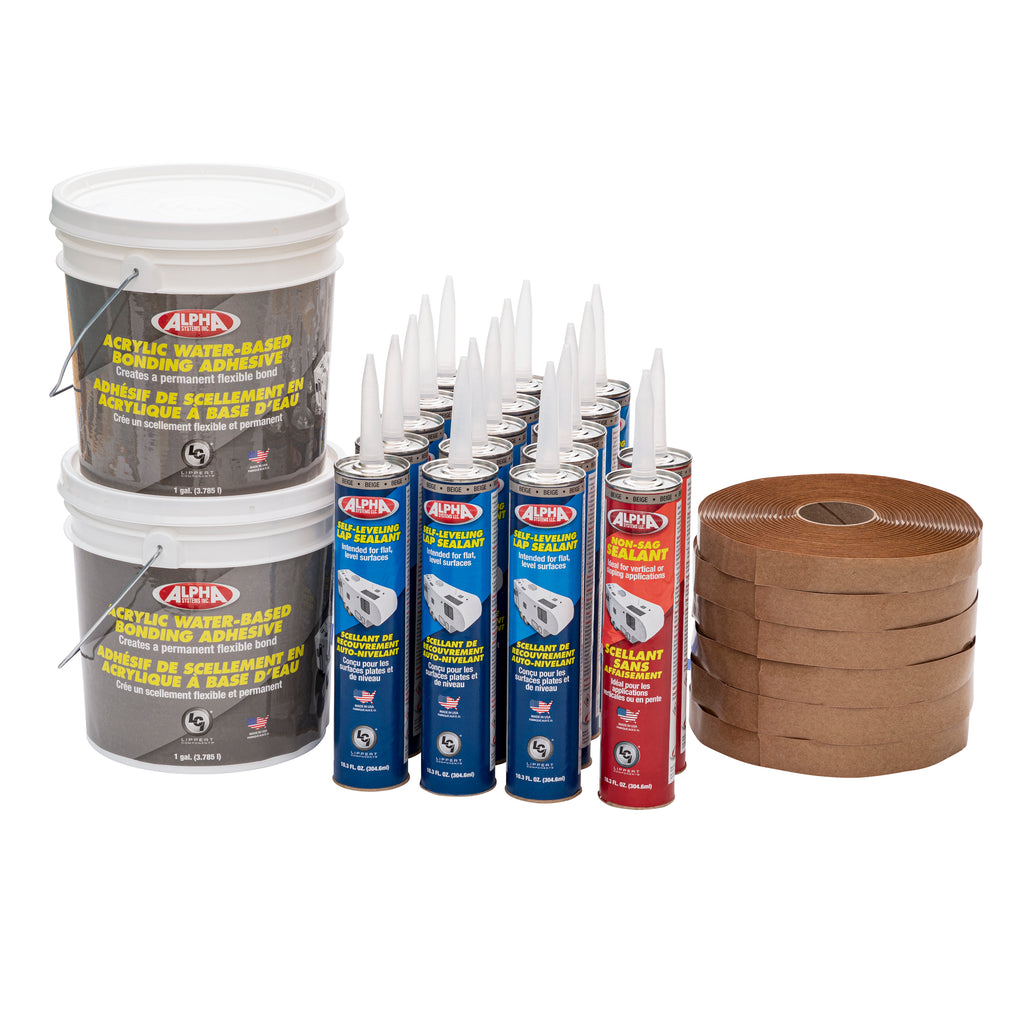 - Comes with: (2) gallons of adhesive, (6) 30' rolls of Q130 Butyl Tape, (15) tubes of 1021 Self-Leveling Sealant, (2) tubes of 1010 Non-sag Sealant