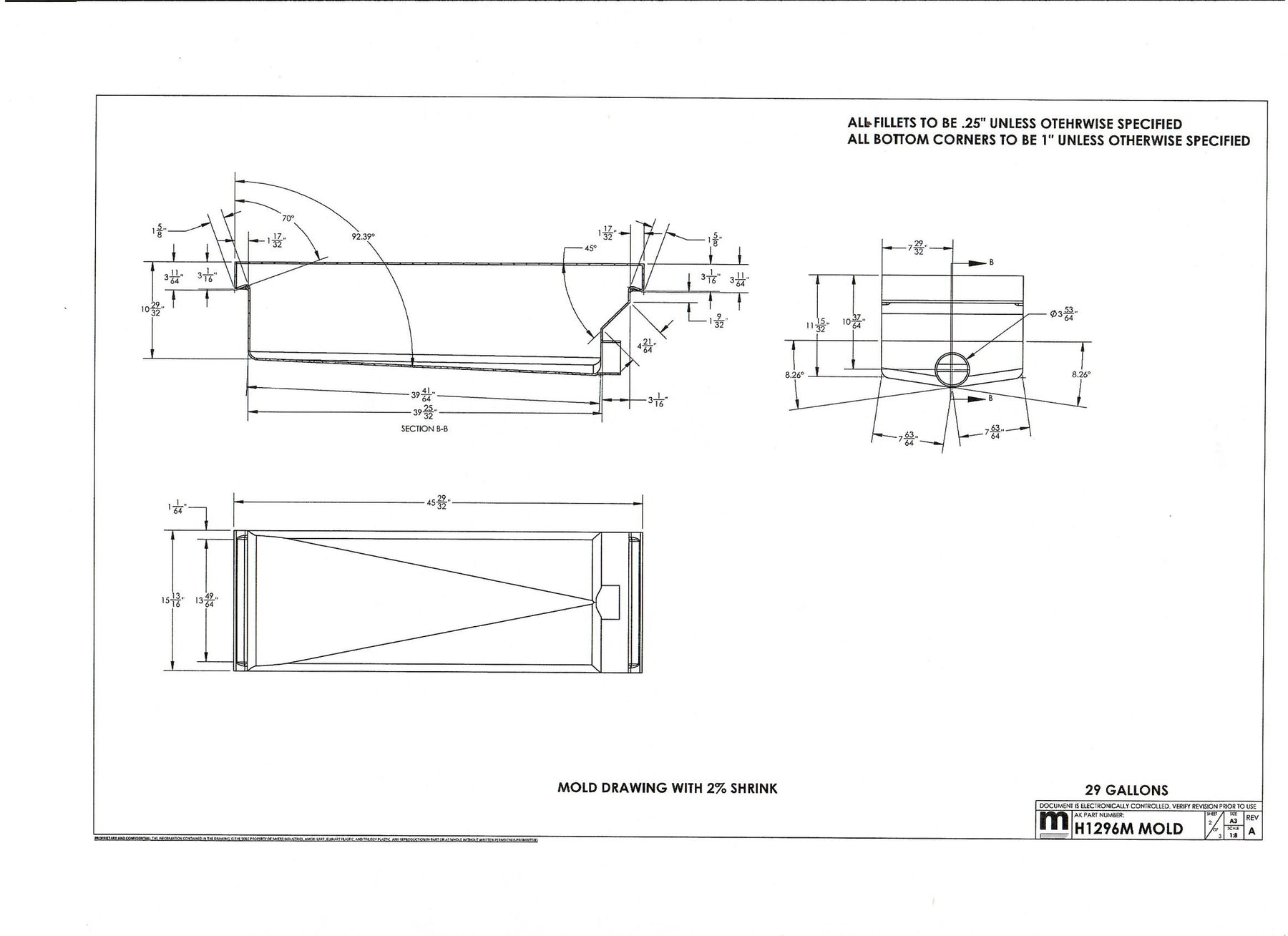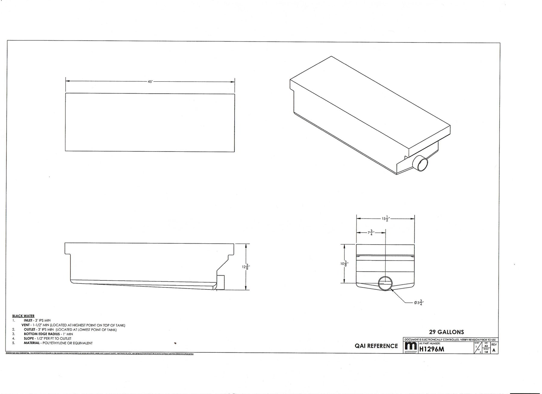- What are the dimensions of this holding tank? The dimensions of the holding tank are 45 inches long, 15-1/2 inches wide, and 12-3/8 inches high.