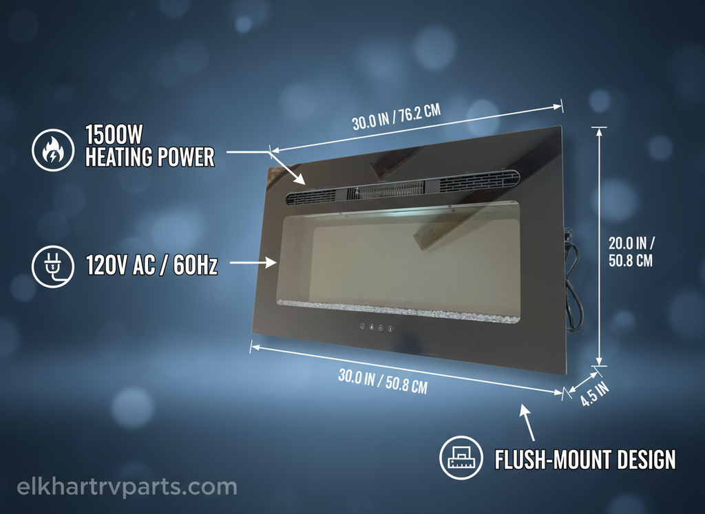 This Covenant electric fireplace is designed as a direct OEM replacement for existing 30" RV fireplace installations. The flush-mount design ensures a clean, professional appearance that integrates seamlessly with your RV's interior. Professional installation recommended for proper electrical connection and optimal performance.