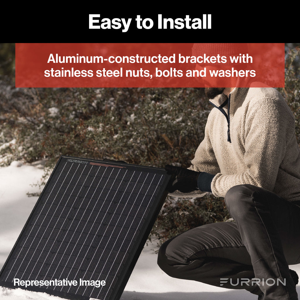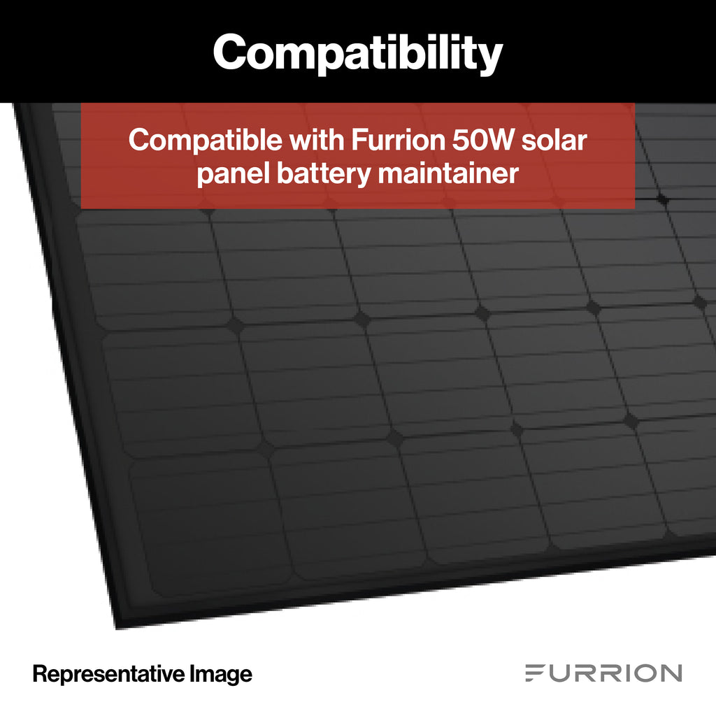 - Which solar panel model is compatible with this bracket kit? This bracket kit is compatible with the Furrion 50W solar panel battery maintainer, specifically model number FSFP50MAT-BL.