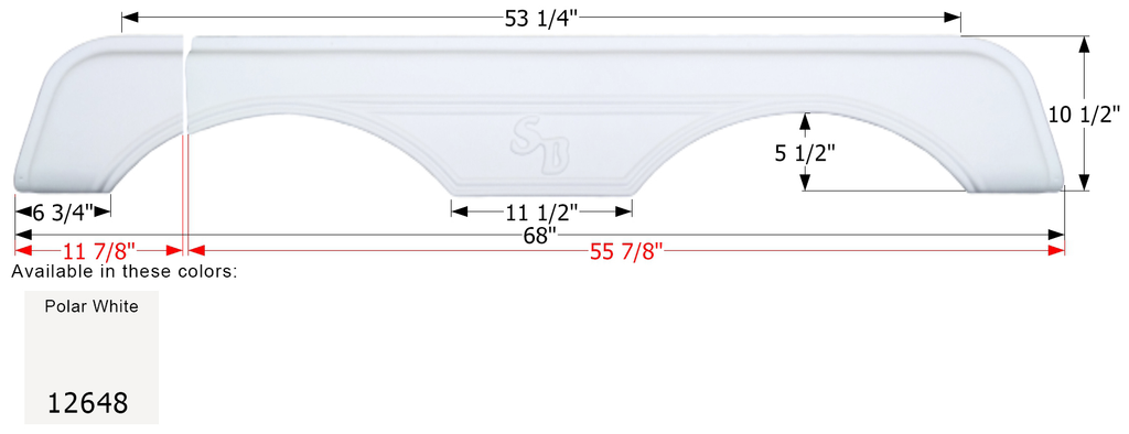Fits various Sunnybrook & Winnebago brands. Slide out split is molded into the part. 1/4" Slide Gap included in the "F" dimension. Individual pieces are 11 7/8" and 55 7/8". Sunnybrook part numbers are FD171LHAW and FD171RHAW. Browse ICON's vast selection of high quality fender skirts designed to fit your RV. Made of scuff and scratch resistant ABS and UV resistant, your brand new set of ICON fenders are designed to last.