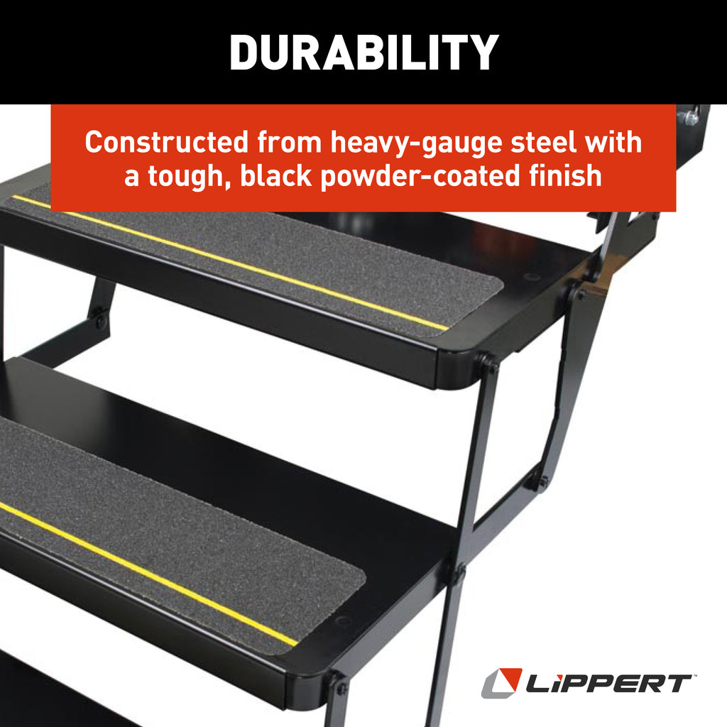 - DURABILITY — Constructed from heavy-gauge steel and coated with a robust black powder finish, these steps are built to withstand rugged conditions, promising lasting durability and resilience against outdoor elements