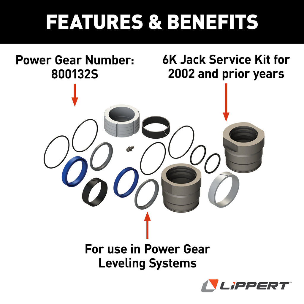 - What is the part number for the lippert 6k jack service kit? The cross-reference part number for the Lippert 6K Jack Service Kit is 800132S.