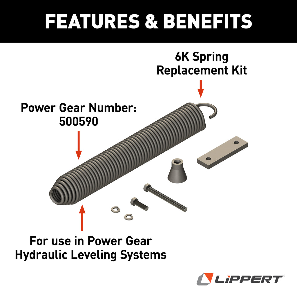 - What is the lippert 6k spring replacement kit used for? The Lippert 6K Spring Replacement Kit is used for Power Gear Leveling Systems to replace the 6K springs.