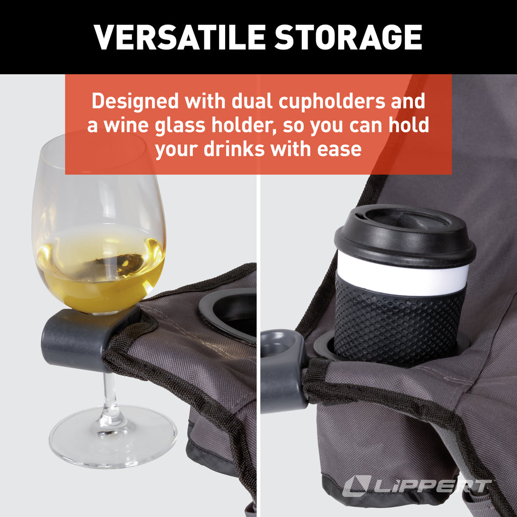 - VERSATILE STORAGE – For ultimate convenience, we designed this camping club chair with dual cupholders and a wine glass holder, so you can hold your drinks with ease