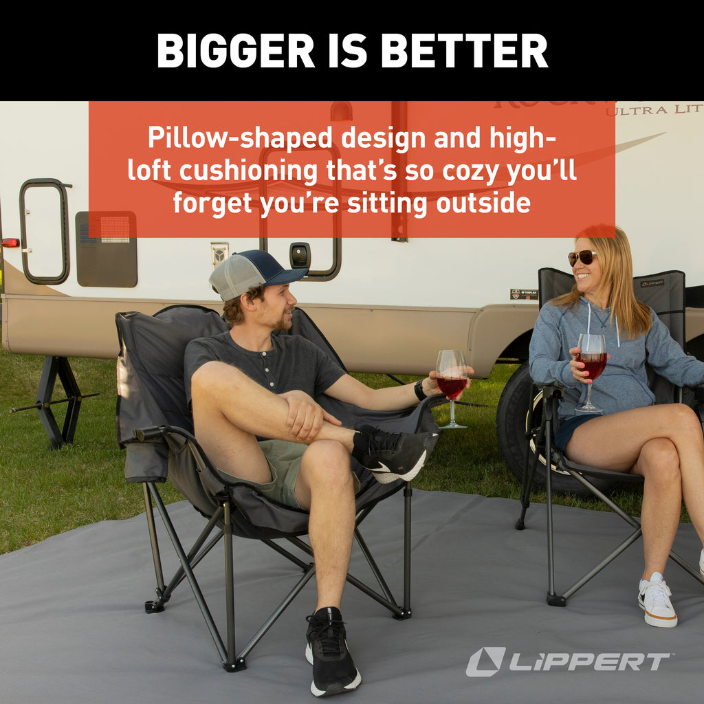 Maximize your outdoor comfort with the Lippert Big Bear club camping chair. The oversized pillow design boasts high-loft cushioning and long-lasting polyester or oxford fabrics that take your outdoor relaxation to new heights.