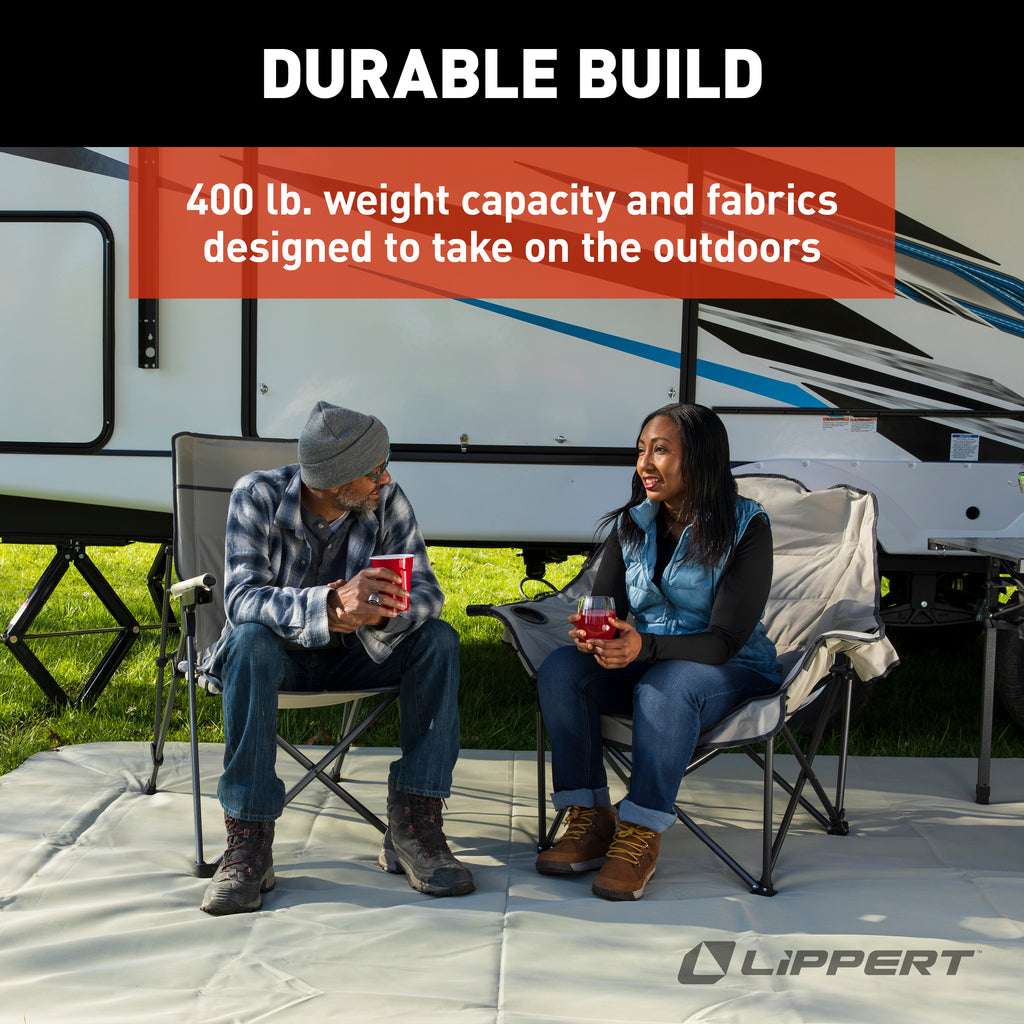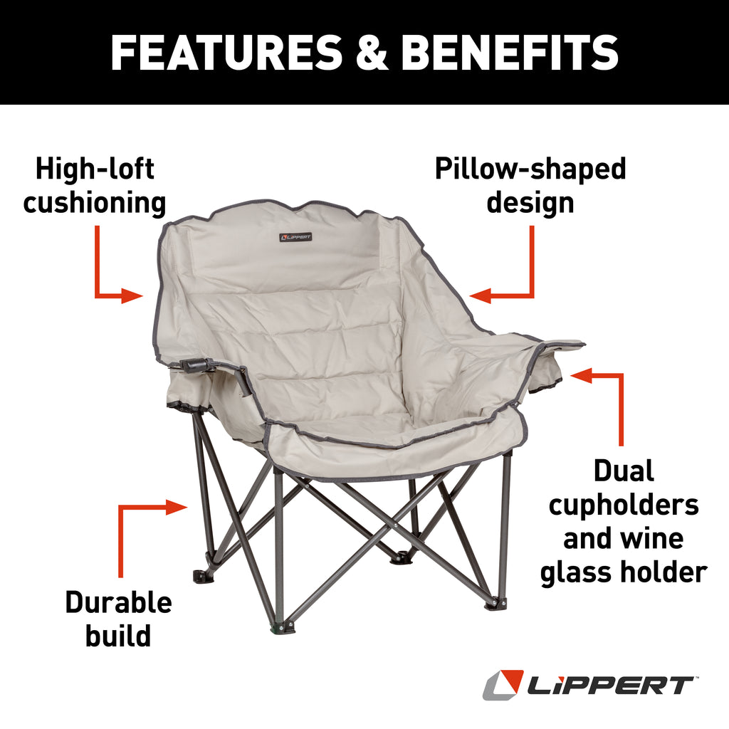 Maximize your outdoor comfort with the Lippert Big Bear club camping chair. The oversized pillow design boasts high-loft cushioning and long-lasting polyester or oxford fabrics that take your outdoor relaxation to new heights.