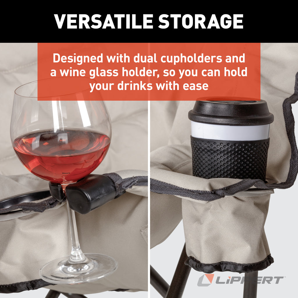 Convenience and comfort align with this oversized camping chair outfitted with a 400 lb. weight capacity and a carry bag for easy storage and transportation. You can also store your drinks in the handy dual cupholders and integrated stemmed wine glass holder. With color options in dark grey and sand, this folding chair is as stylish as it is cozy.