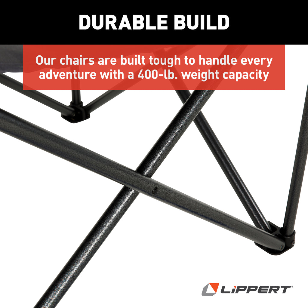 Gear-up for the great outdoors with a premium camping chair from Lippert! This lightweight, folding camping chair comes equipped with resilient polyester or oxford fabric, high-loft padding for extra comfort, a steel frame construction and dual cupholders for your favorite outdoor beverages. Complete with a convenient carry bag, this will forever be your go-to chair for campfires, cookouts, soccer games and more!