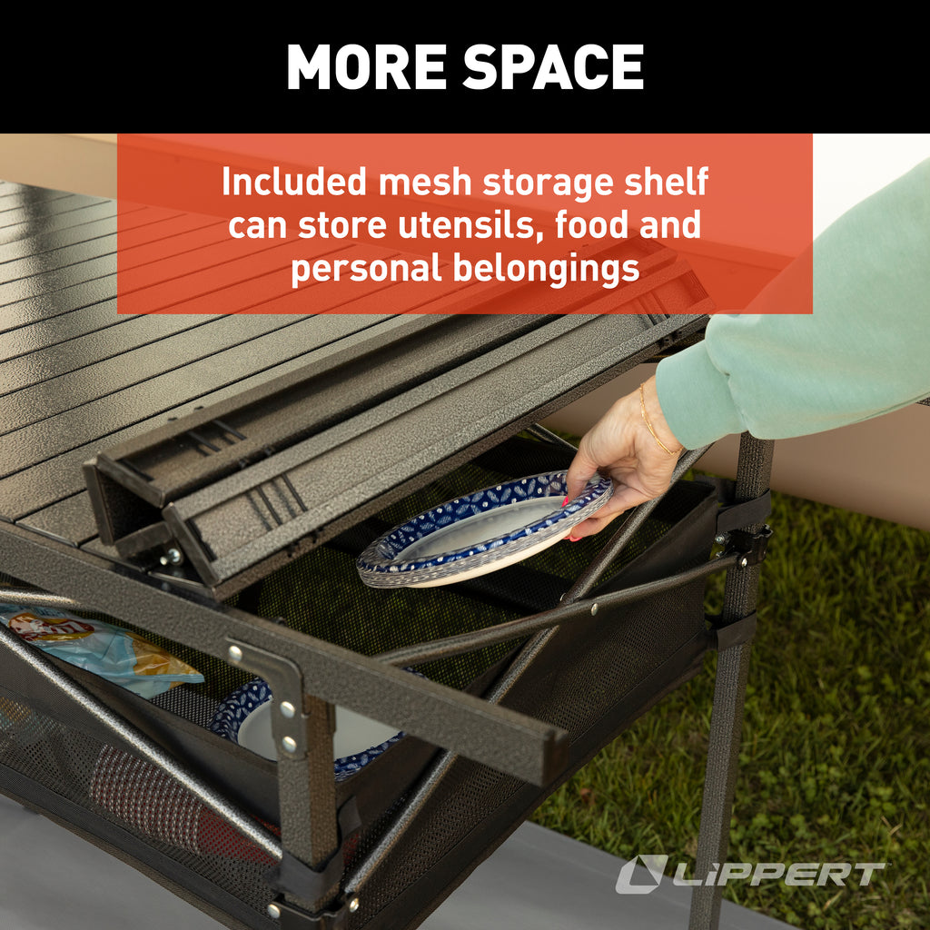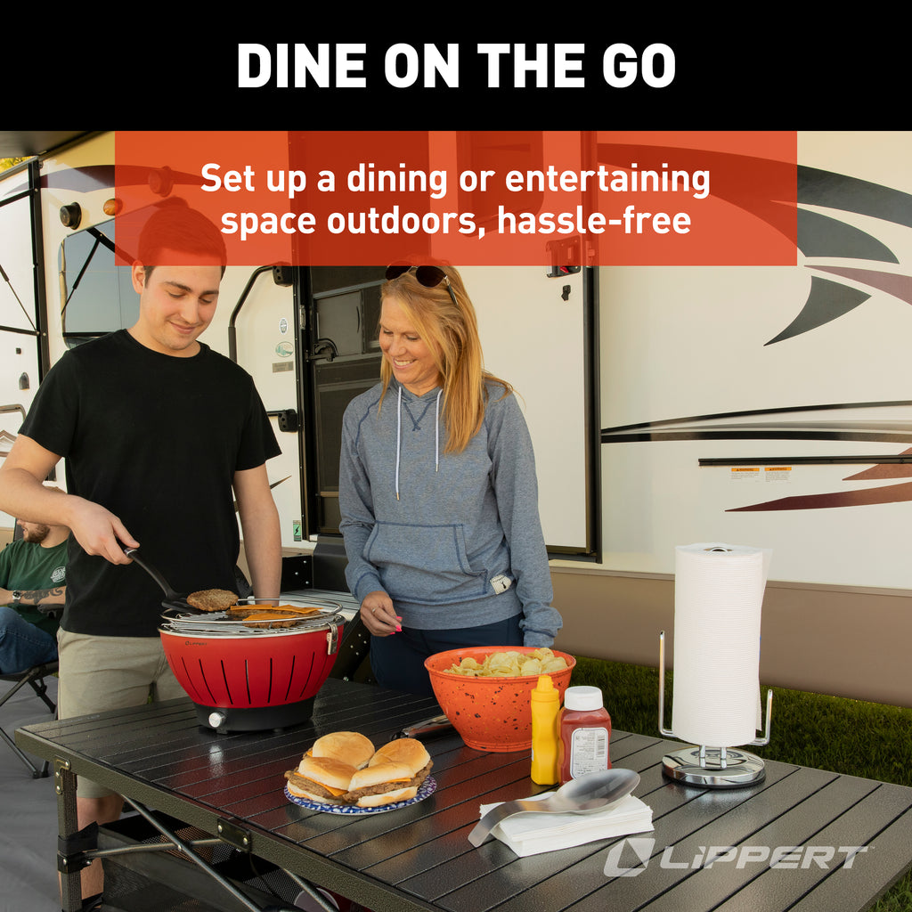 Lippert camping tables let you enjoy the great outdoors without the hassle that comes with bulky gear. Foldable, portable and lightweight, our tables allow you to prep food, dine with family and friends or gather for game night. Enjoy more room outside, whether you’re at the campsite, backyard barbecue or on the sidelines during game day.