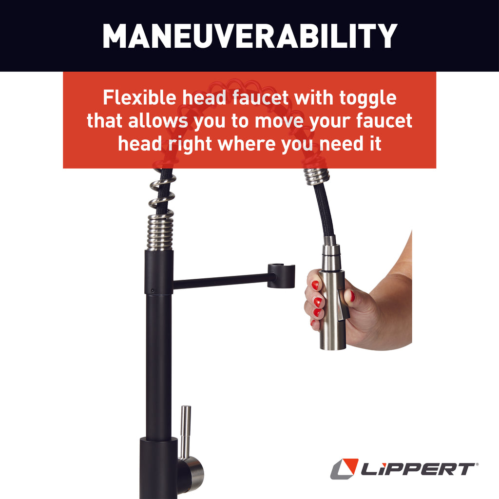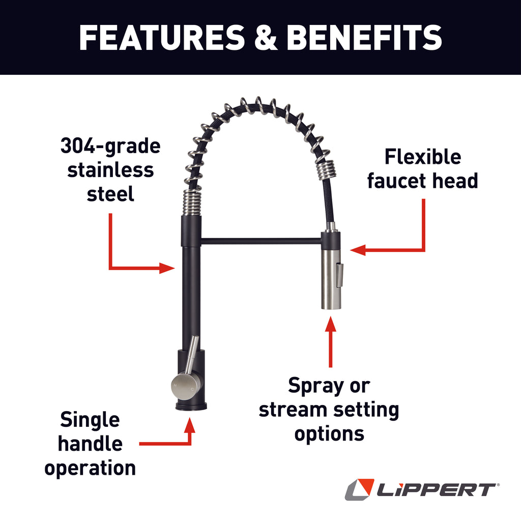 Looking to upgrade your kitchen's aesthetic? The coiled faucet from Lippert boasts a flexible head, as well as spray and stream functions that let you effectively rinse and clean dishes. Complete with a sleek, black or stainless steel finish our faucets provide your kitchen with a high-end modern look and the single handle design offers ease of use. Perfect for homes or RVs, these faucets also pair well with our stainless steel kitchen sinks. You can also explore our line of stainless steel and black bathroom faucets to give your house or RV a modern look throughout.