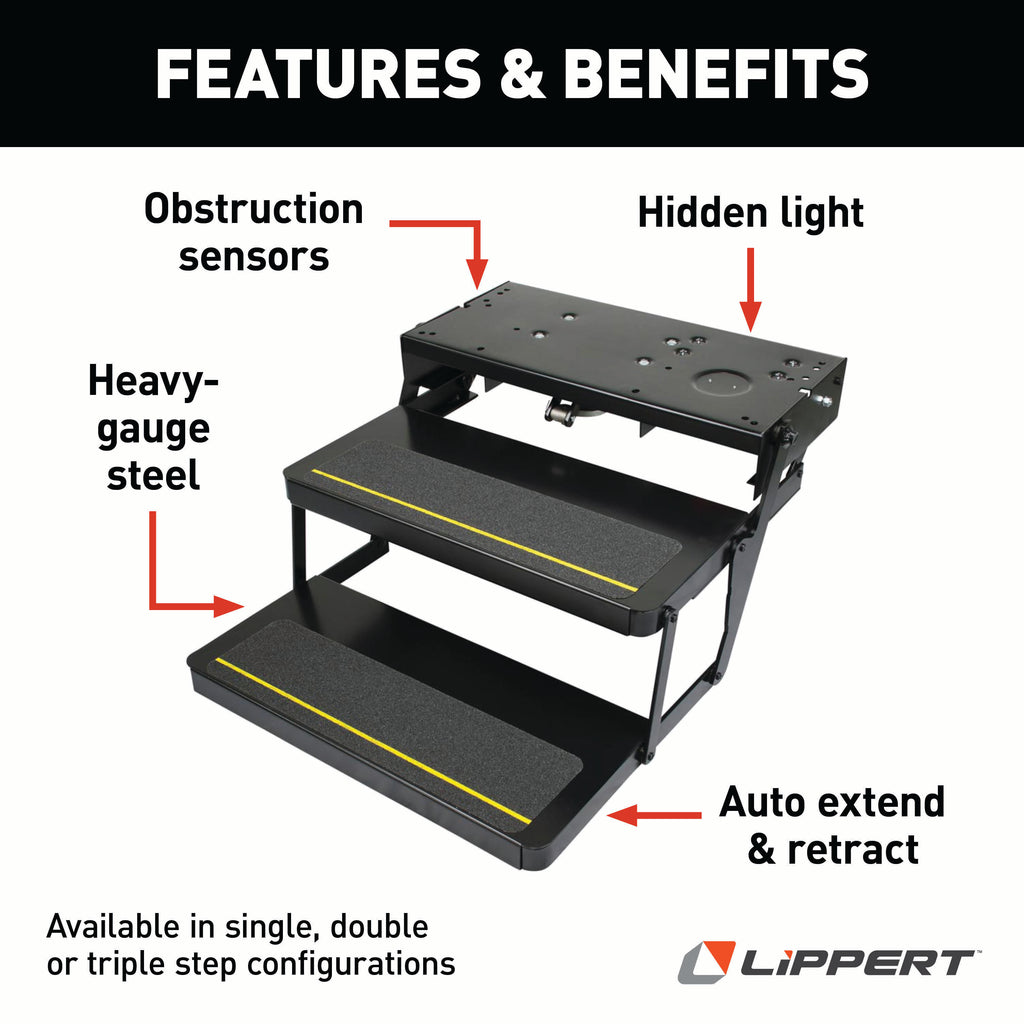 The Kwikee Electric Steps by Lippert are available in single, double or triple step configurations with multiple assembly options available. Kwikee steps are powered by a strong, 12V-DC motor that comes complete with sealed wiring connections.