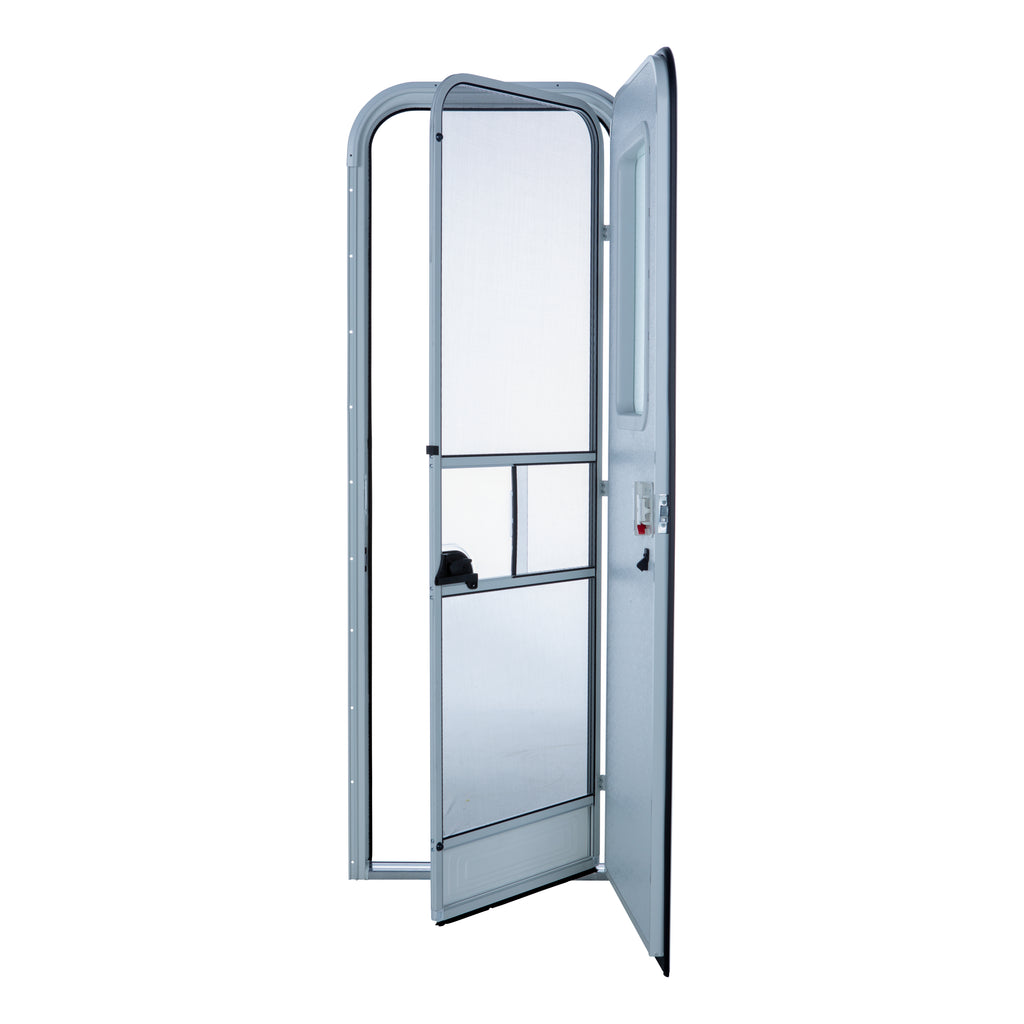 Need an upgrade or replacement entry door for your RV? Lippert® has you covered. No matter your RV, we offer a variety of sizes and configurations to fit your trailer's needs. Our radius entry doors come equipped with a white finish, 9-1/2" right hinges, screen door with oversized pull-down latch, UV-stable, obscure window glass, an integrated felt seal and built-in camber. This door assembly includes everything you need to fix or upgrade your entryway with total ease.