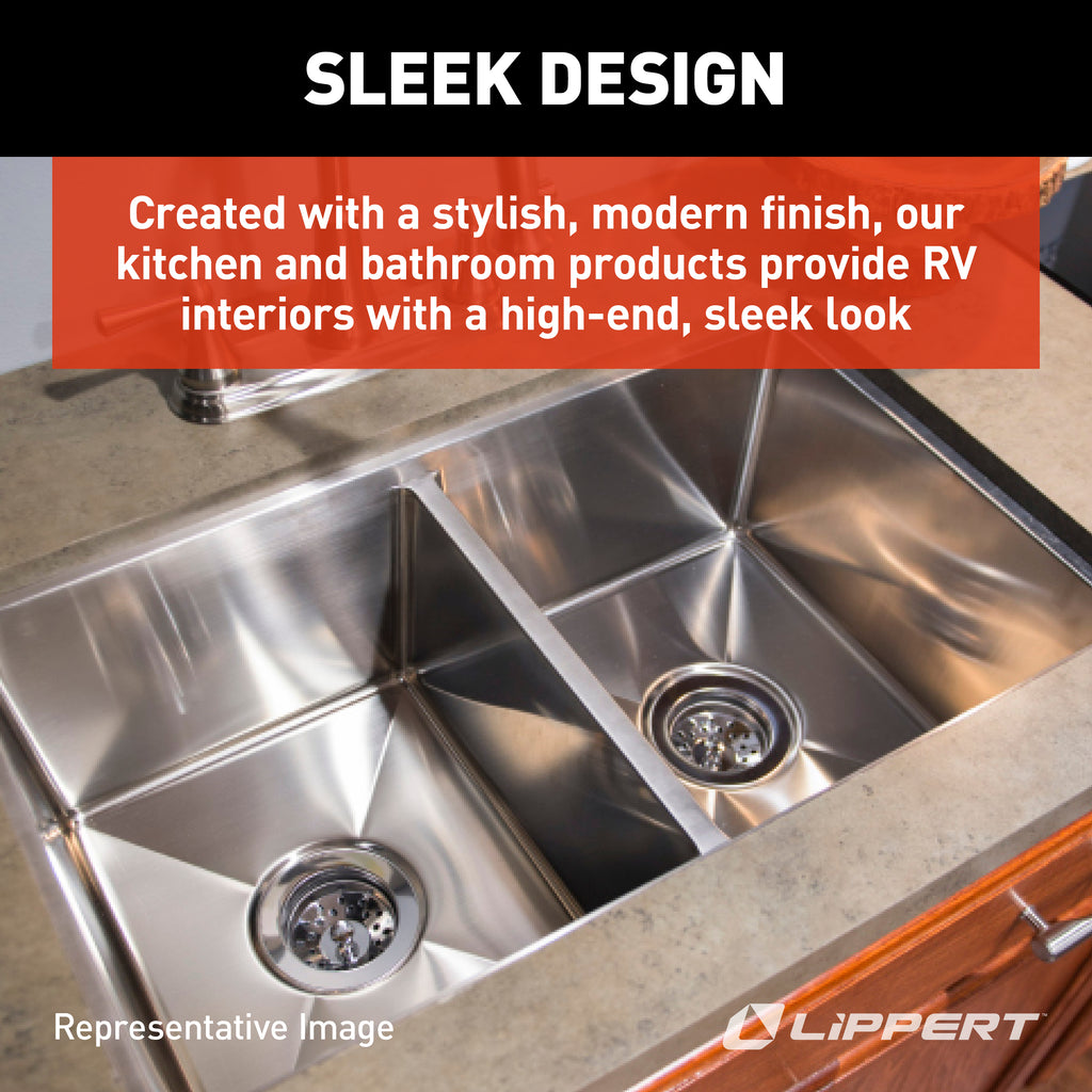 - Is the lippert rv double kitchen galley sink easy to install? Yes, the sink is designed for DIY installation and is lighter than fiberglass, making it easier to lift and position into place.