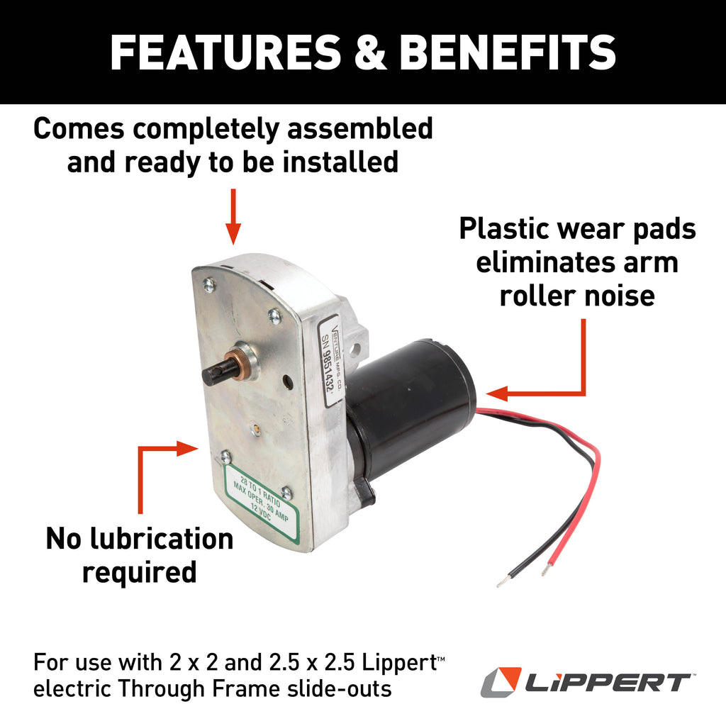 - What type of slide-out system is the lippert rv slide-out 28:1 venture motor compatible with? The motor is compatible with Lippert electric Through-Frame slide-outs, specifically 2 x 2 and 2.5 x 2.5 slide-outs, and works with Venture actuators.